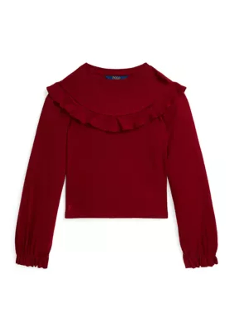 This top is made with an ultrasoft cotton-and-modal blend and detailed with cute ruffle trim. By choosing cotton products, you're supporting investment in the Better Cotton™ mission to help cotton communities survive and thrive, while protecting and restoring the environment. This product is sourced via a system of mass balance and therefore may not contain Better Cotton™. Visit bettercotton.org/mass balance for more information about mass balance. Size medium has a 17.5" body length (front and back) and a 26" sleeve length. Sleeve length is taken from the center back of the neck. Signature embroidered Pony at the right hem. Crew neck. Long sleeves. Elasticized cuffs with ruffle trim. Ruffle overlay along the yoke. Imported Material & Care Cotton, modal Machine washable