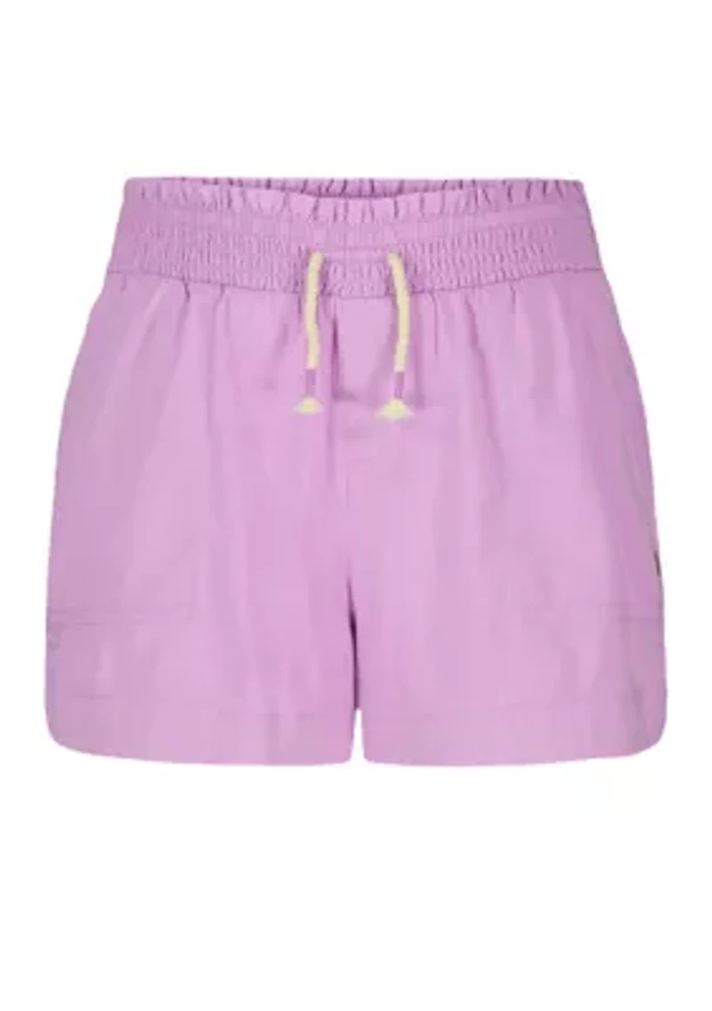 These chic Roxy shorts are perfect for active girls, providing comfort and style all day long. Fabric: cotton, rayon, brushed twill Fit: regular fit Inseam: 2.75" (size m) Waist: smocked elastic waistband Closure: front functional drawcord maintained on back by bartack Branding: metal logo charm Drawstring waistband Imported Care Machine washable