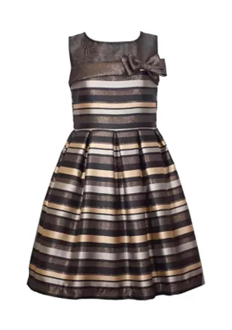 An elegant illusion neckline trails down to a multi-color metallic stripe on this fashion-forward dress by Bonnie Jean, a perfect look for your future fashionista. Button closure Round neck Sleeveless Imported Product Specifications Knee length Material & Care Cotton, polyblend Machine washable