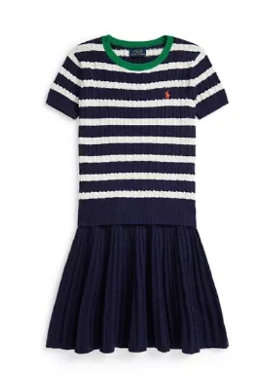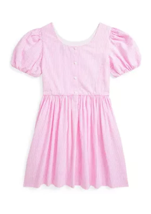 Designed with a fit-and-flare silhouette and striped cotton seersucker, this Ralph Lauren Childrenswear dress is a too-cute pick for the warmer months. Fit-and-flare silhouette Size 10 has a 30" body length (front and back) Rounded neckline Buttoned placket at the center back Short balloon sleeves Princess seams at the front and back bodice Shirred waist with piped trim Side on-seam pockets “Polo” embroidered at the right hem Lined at the bodice and sleeves By choosing Ralph Lauren's cotton products, you’re supporting the investment in the Better Cotton™ mission to help cotton communities survive and thrive while protecting and restoring the environment. This product is sourced via a mass balance system and therefore may not contain Better Cotton™. Visit bettercotton.org/massbalance for more information about mass balance Imported Material & Care Cotton Machine washable