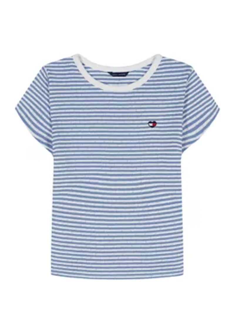 Made with subtle stitching and ribbing, this pointelle t-shirt from Tommy Hilfiger features feeder stripes and heart flag embroidery for branded style. Pullover Crew neck Short sleeves Imported Material & Care 100% polyester Machine washable