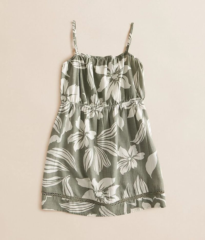 Tropical print linen blend square neck dress Elasticized waistband Adjustable straps Crochet inset Body length up to 29" on size medium