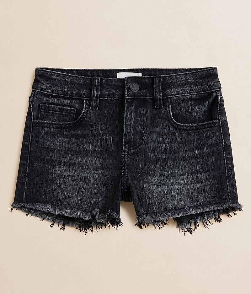 Mid-rise zip fly 2 1/2" shortie cuffed short, 4" uncuffed Slim through the hip and thigh Adjustable waistband Snap button closure in sizes 5-8 Regular button closure in sizes 10-16 Destruction details