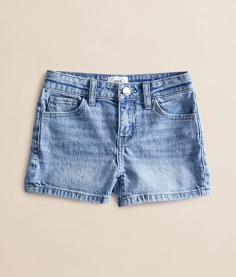 Mid-rise zip fly 3" short Slim through the hip and thigh Adjustable waistband Snap button closure in sizes 5-8 Regular button closure in sizes 10-16