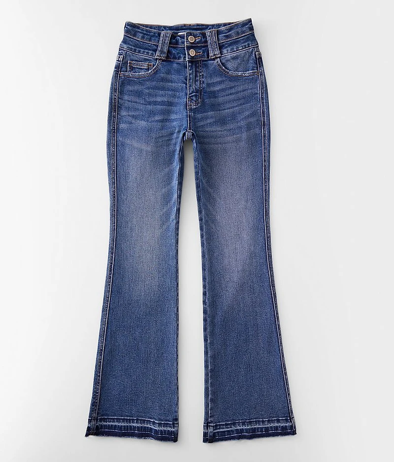 High rise zip fly stretch jean Regular inseam measures 28" on size 10 and will grade accordingly to size 18" bottom opening Slim through the hip and thigh Adjustable pieced waistband Snap button closure in sizes 5-8 Regular button closure in sizes 10-16 Comfort waistband Destruction details