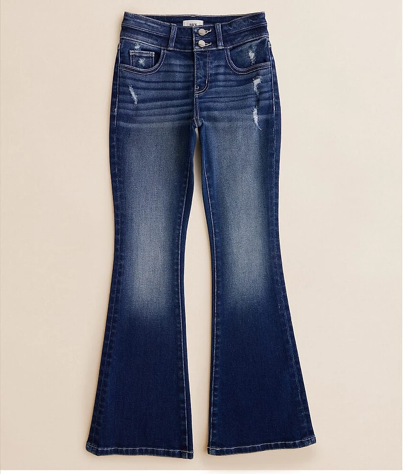 Mid-rise zip fly stretch jean Short inseam measures 26" on size 10 and will grade accordingly to size Regular inseam measures 28" on size 10 and will grade accordingly to size Slim through the hip and thigh 18" bottom opening Adjustable pieced waistband Snap closure in sizes 5-8 Regular button closure in sizes 10-16 Destruction details
