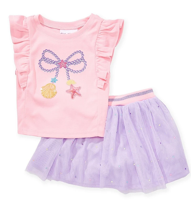 Girls Like Us Little Girls Ruffle Sleeve Sequin Sea Shell Applique Embroidered Tank Top & Sparkle Rhinestone Skort Set