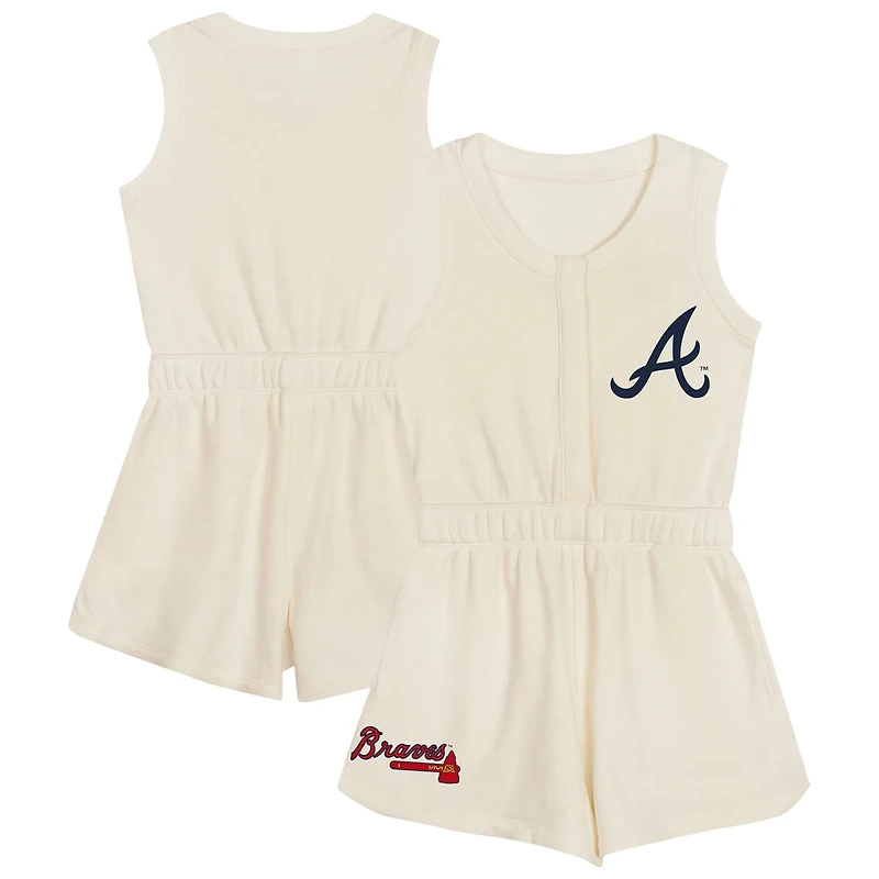 Get your little Atlanta Braves fan ready to cheer on their favorite team with this adorable Girl Power Tank Romper This romper features a screen-printed team logo on the chest and leg letting your little one showcase their Atlanta Braves pride in style With its soft breathable cotton fabric and elastic waistband this romper ensures a comfortable and flexible fit for all-day wear