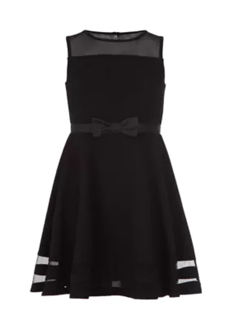 Simple, elegant and comfortable, this dress by Calvin Klein features a sleeveless fit-and-flare silhouette trimmed with mesh; a satin belt cinches the waist while a playful skirt amplifies her twirl power. - Fitted bodice with full skirt and mesh trim along the neck and hem/Comfortable fabric with stretch (spandex) - Fit and Flare silhouette, hem of dress hits above the knee - Back button and zip closure - Ribbon belt with non-functional bow Zip closure Ribbon belt with non-functional bow Fitted bodice with full skirt and mesh trim along the neck and hem Fit-and-flare silhouette, the hem of the dress hits above the knee China Imported Material & Care Comfortable fabric with stretch (spandex) Cotton/Spandex Machine washable