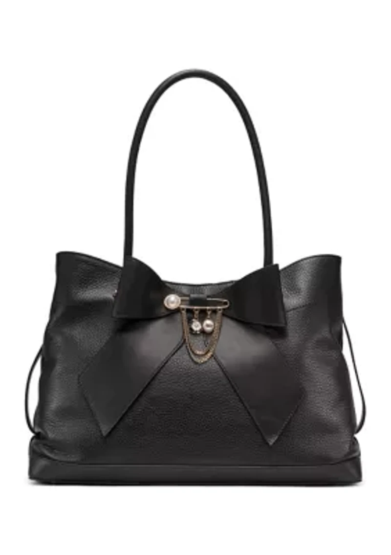 Add a touch of elegance to any look with this KARL LAGERFELD PARIS tote bag. Its unique bow detail offers a chic vibe that effortlessly elevates any outfit. Magnetic closure 25" handle drop Shoulder strap Interior: middle zipper pocket, 1 zipper pocket, 2 slip pockets, card slots Imported Product Specifications 11" x 16" x 7" Material & Care Leather trim Leather Spot clean only