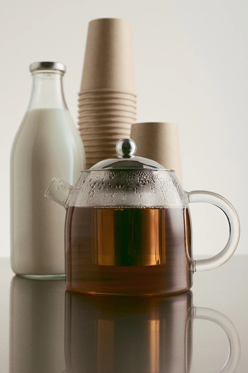 Teapot in clear, durable borosilicate glass, ideal for serving hot, delicious drinks. Stainless steel lid and infuser. Capacity approx. 28 fl. oz.