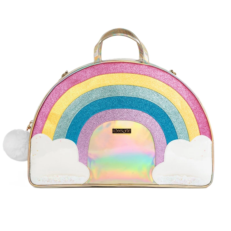 Unicorn Rainbow Overnight Bag. Features: The Perfect Overnight Bag - With our Unicorn Overnight Bag you have all you need to keep you sleepover ready! It's also the perfect weekender bag! Shaped like a rainbow with sparkles, this cute unicorn bag is designed for easy packing and is the perfect carrier for all of your clothes!. Travel in Style - Get ready for compliments galore with this big, glimmering rainbow in tow! This darling travel tote comes with a detachable shoulder strap and secure closure with the Glimmer Wish Heart of Gold zipper pull and fluffy, white cloud poof for ease of use when opening/closing the zipper!. Designed with Love - Our glimmering Unicorn Travel Bags are designed with you in mind, cute, functional and oh so fun! Tested and traveled with by the founder herself, it's proven to get all the compliments!. Perfect Gifts for Girls - And anyone who loves Unicorns! The Glimmer Wish Overnight Bag is a perfect gift to fill with other smaller gifts, so it's like a gift bag but one you will keep forever! Add a Glimmer Wish Hair Brush, and a few other unicorn themed items and you have the perfect gift for anyone who needs their own Rainbow!. Designed for Overnight Trips - Our overnight Bag is the largest travel bag in our collection. It's the perfect size to pack all of your OOTD, shoes, or jacket! You can also use it as a carry-on! Place it on top of your large roller suitcase and off you go leaving a trail of smiles behind you!. : :