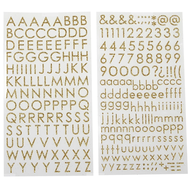 These alphabet stickers make customizing labels and projects as easy as 1-2-3! With a sparkly glitter treatment and a classic sans serif type design, the uppercase and lowercase letters, numbers and punctuation marks are perfect for adding playful color and imagination to scrapbooks, handmade cards, journals, school projects and more. Details:Available in multiple colorsApproximately 3/8" (0.95 cm) tall2 sheetsIncludes letters, numbers and symbols