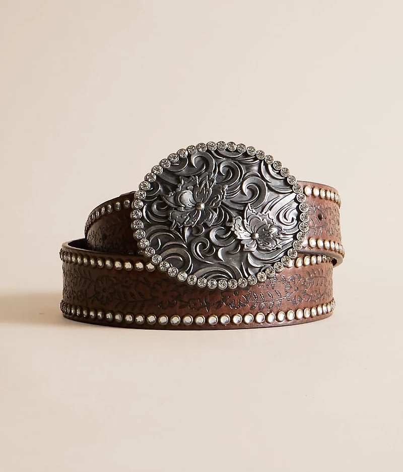 Floral embossed rhinestone 1 1/2" faux leather belt