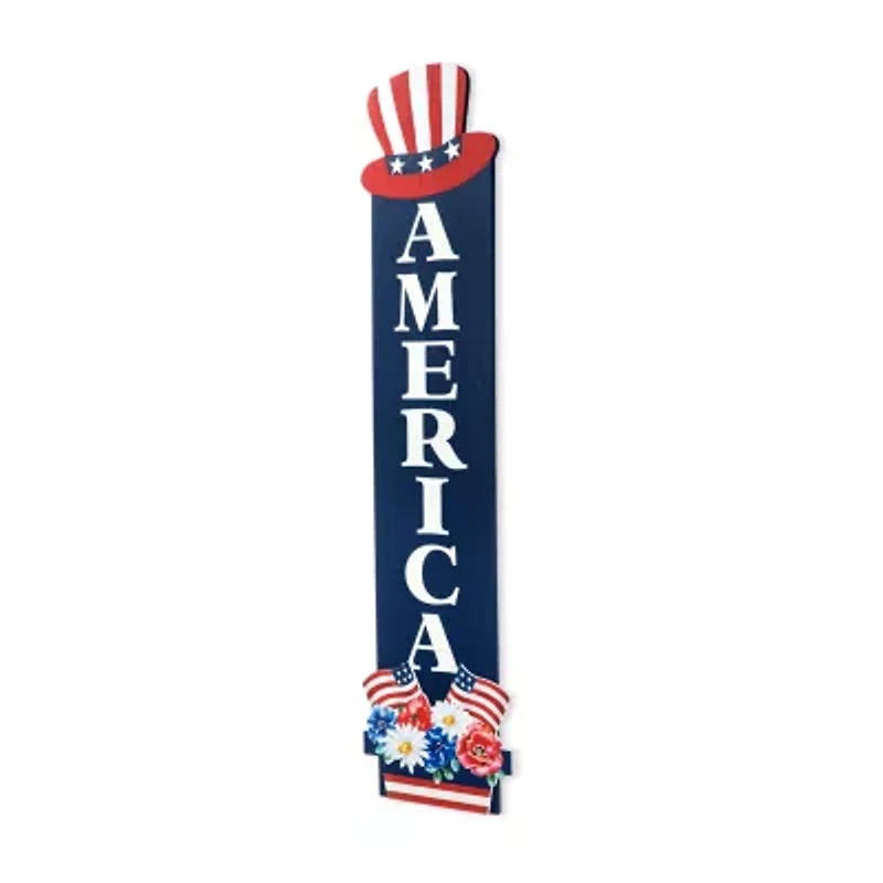 To celebrate and decorate your July 4th holiday by using this vertical porch leaner. The centerpiece boasts a "America" greeting, while the top adorned with a uncle SAM hat and the bottom with a bunch of flowers and national flags bestow celebrating and cheering on your festivities.