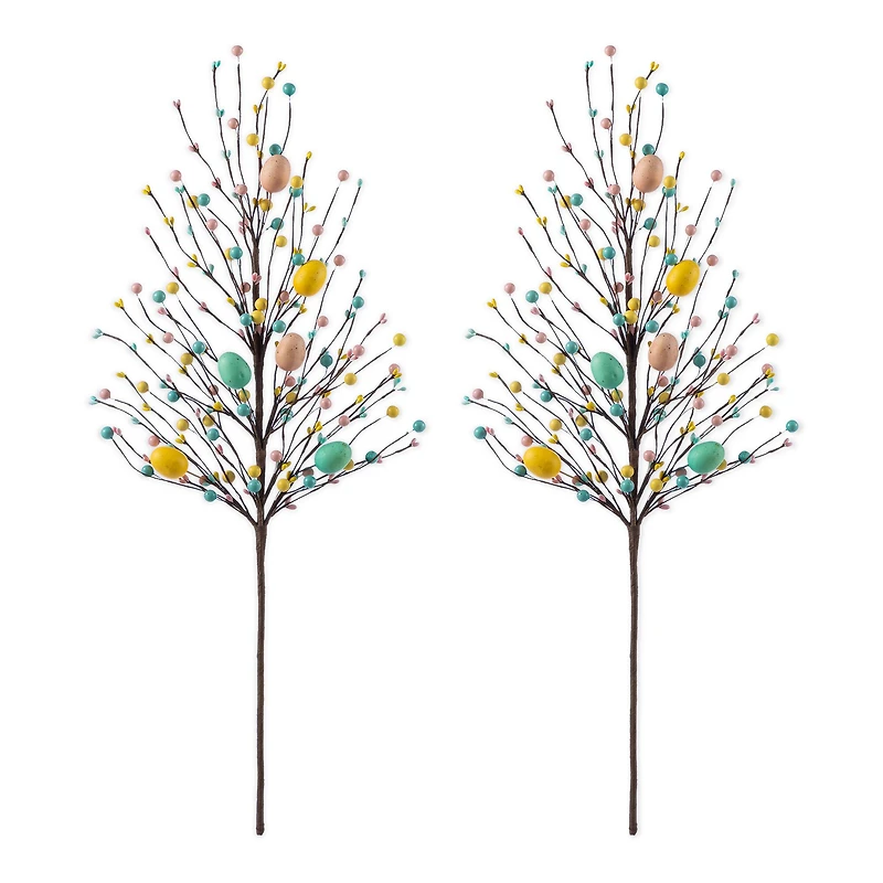 This Set of 2 28"H Easter Picks features slender brown stems adorned with pastel colored berries and Easter eggs in shades of pink, yellow, and blue, making them ideal for adding a festive, springtime touch to Easter floral arrangements or decor. Details: Set of 2 Easter picks Colorful berries and Easter egg accents Multi color 10"L X 1"W X 28"H 0.66 lb. Made of 90% Styrofoam, 5% Iron wire and 5% Paper Handcrafted Great for floral arrangements No assembly required