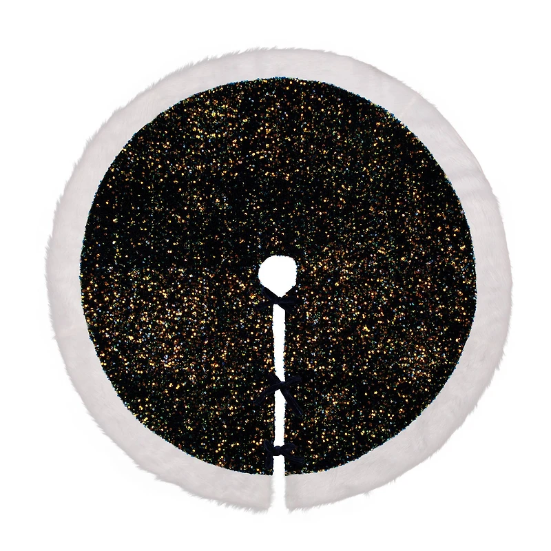 The blue sequin tree skirt decorated with white faux fur cuff. Blue velvet ropes attached for your easy knotted. Dress up your Christmas tree with this gorgeous sequin tree skirt! Blue sequin with shiny look, faux fur edge with a luxury feeling. Festive style to add cheer to any home this year!Details:Navy blue with white cuff48" (121.92 cm) diameter PolyesterRecommended for indoor use only