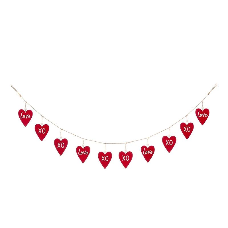 Decorate for the holiday season with this romantic accent that will keep your space festive and fun! This metal heart-shaped garland features "XO" and "Love" written on the hearts. Hang this garland strand on your mantel, or place it as part of a centerpiece on a table for a fabulous, festive look!Details:Red and white6 ft. (1.82 m)Iron, wood and jute