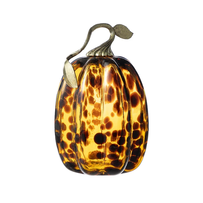 This glass pumpkin features a rich amber hue with dark contrasting dots, a glossy finish, and realistic stem and leaf details. Its elegant design and compact size make it a perfect accent for fall-themed tabletops and seasonal displays.Details:AmberAvailable in multiple sizesHandcrafted—each one is unique and exquisiteGlassRecommended for indoor use only