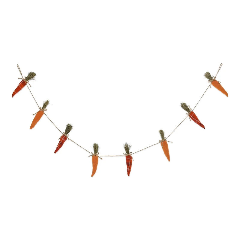 Spring into the Easter holiday with this adorable carrot garland. Hang it from your mantel, wall, or any other area that needs added holiday delight. This garland is also a perfect piece to showcase during an Easter party. Details: Easter Burlap Carrots Garland design 6 ft. 0.18 lb. Features 8 carrots Handmade Made of 50% cotton, 25% polyester, 20% burlap, and 5% plastic For indoor and outdoor use