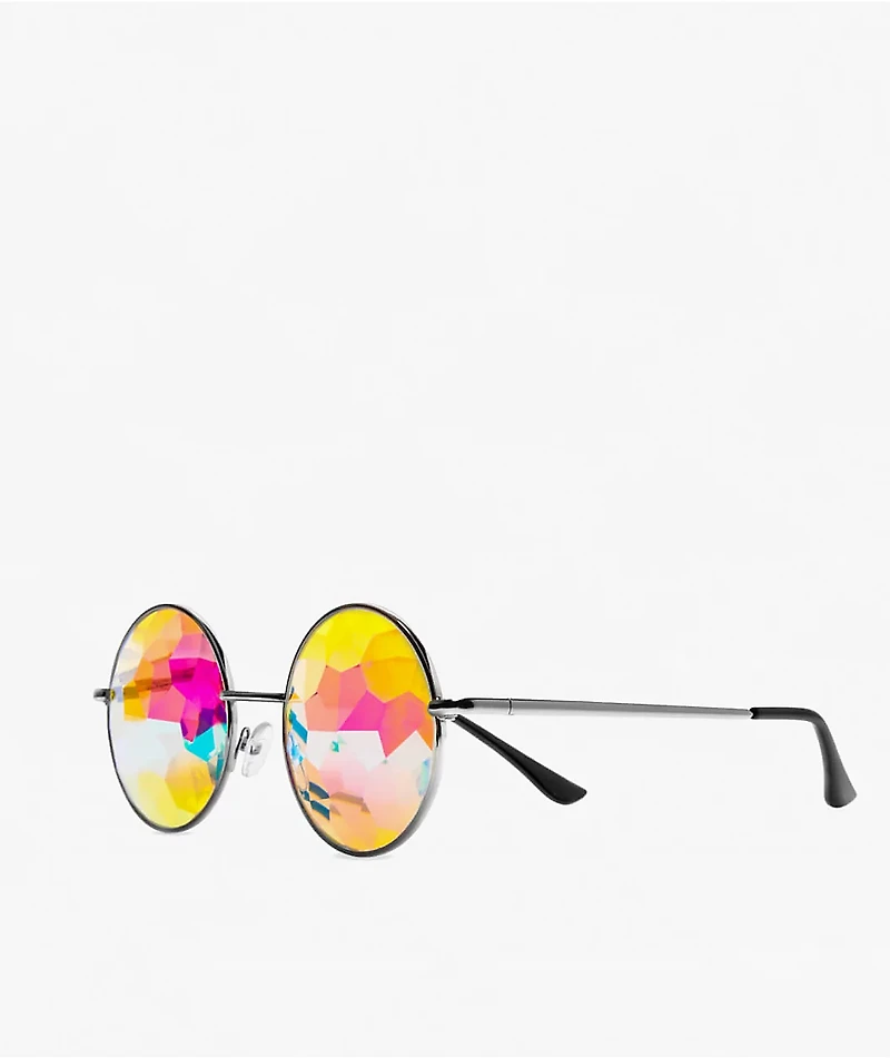 The Imagine Kaleidoscope glasses from GloFX were designed as party-enhancing rave eyewear in a silver metallic circle frame with high-quality edge-cut mineral glass lenses. Boasting Rainbow Spectrum Technology to display an endless amount of hues, to