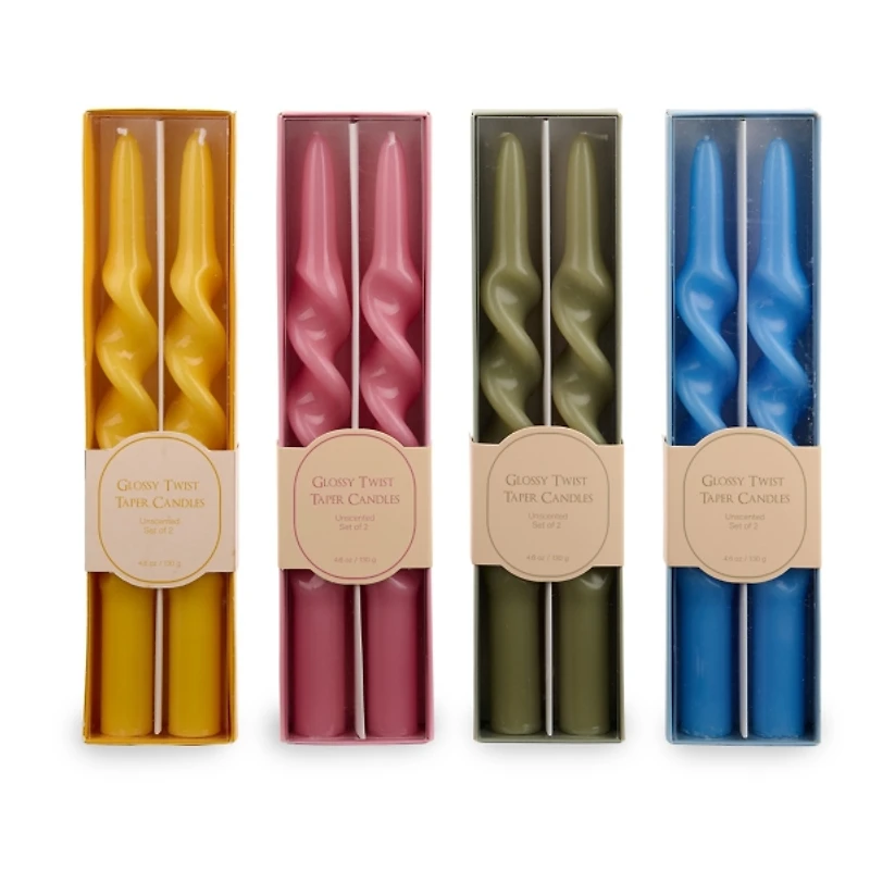 Add a pop of color and playfulness to your home decor with our Glossy Twist Taper Candles! They're perfect for giving your centerpiece a bright, whimsical glow. Sold as individual sets in store Candle measures 9.8H x 0.9 in. in diameter 2.3 oz. candle Packaged in sets of 2 Paraffin blended wax Unscented Single wick design Available in hues of yellow, pink, green, and blue Care: Trim wick to 1/4 inch prior to lighting. Do not allow wick trimmings to accumulate in wax pool. Place on a temperature safe surface. Burn for 2-3 hours at a time. Never leave burning candles unattended. Burn within sight. Keep away from anything that can catch fire. Keep out of reach of children and pets. Discontinue use when 1/4 inch of wax remains. Contact your local Kirkland's store for availability. Quantities and selection may vary by location. WARNING: Cancer and Reproductive Harm - For more information go to www.P65Warnings.ca.gov .