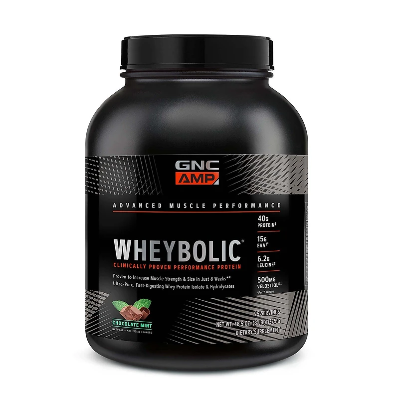 Gnc amp - wheybolic clinically proven protein powder gnc amp wheybolic is america #1 protein powder brand for building strength ^▪ clinically proven protein: wheybolic provides a core of whey protein and leucine that has been clinically proven to increase muscle strength and size in just 8 weeks. ▪ it also enhanced with more leucine and bcaas than standard whey protein to muscle growth and recovery. Accelerate muscle protein synthesis: this formula features a blend of ultra-pure, fast-digesting whey protein enhanced with velositol , a complex of amylopectin and chromium, and leucine to boost muscle protein synthesis. The most effective performance protein available: wheybolic is clinically proven to strength, performance, and stamina▪