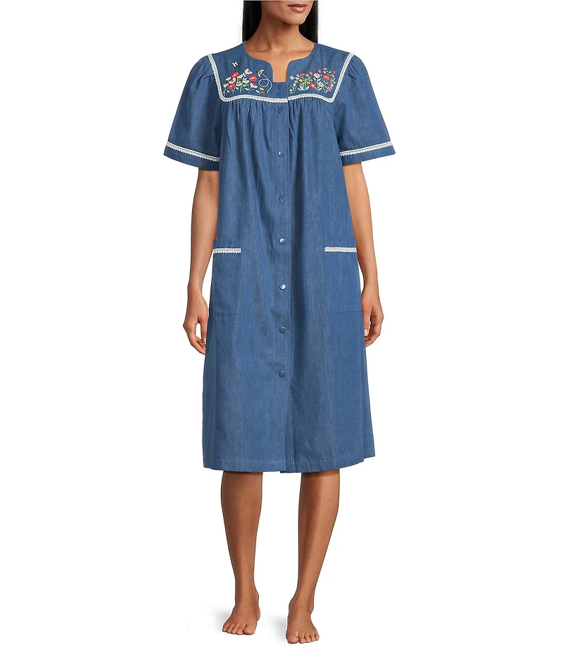 Go Softly Embroidered Bees Short Sleeve Snap Front Denim Patio Dress