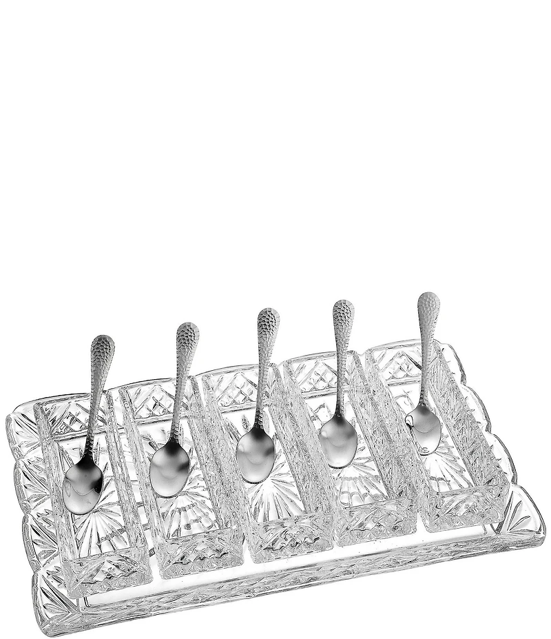 From Godinger, this condiment server features:  Godinger's Dublin Condiment Server is a must have for your entertaining needs.  Great for relishes, sauces, condiments, olives, pickles.  The options are endless.  Non-Leaded Crystal  Heavy Cut Dublin Pattern  Dishwasher Safe  The 11 Piece Condiment Set Includes: 5 Each Removeable Sections, approx. 5.75" W x 8.25" L x 1.45" H  5 Stainless Spoons  1 Tray, approx. 11.95" W x 12" L x 1" H  Imported.