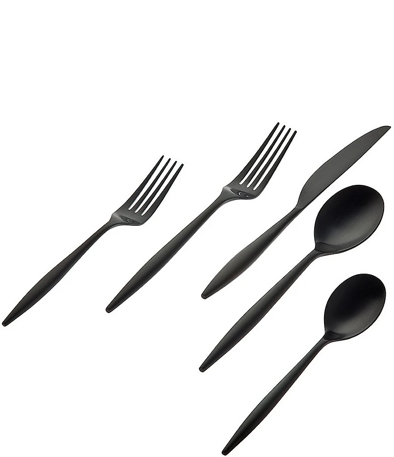 From Godinger, this flatware set features:  Godinger's Milano Pattern is a modern sleek design for the upscale lifestyle  Black Matte Finish  18/10 Stainless Steel 20 Piece Serves 4  Dishwasher Safe  Set Includes:  4 Each Dinner Fork, approx. 8.6" L 4 Each Dinner Knife, approx. 9.4" L 4 Each Tablespoon, approx. 8.05" L 4 Each Teaspoon, approx. 6.9" L  4 Each Salad Fork approx. 7.6"L Imported.