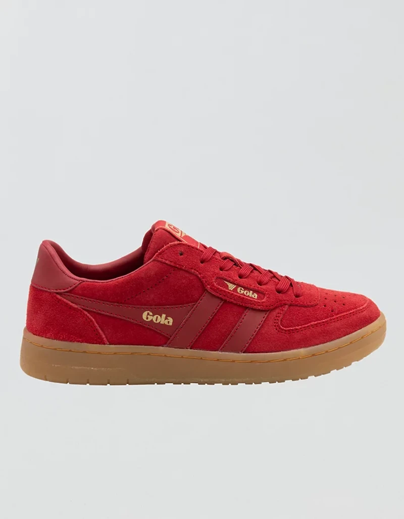 This full suede, self-colour edit of the top selling Gola style Hawk gives a lust-worthy season colour pop to any sneaker collection. Hawk Suede ‘86 incorporates layered panels on a classic court-sport inspired upper, to give an effortless contemporary look. Featured here in red tones that are season relevant and are perfectly co-ordinated with a full gum outsole for a go-to old school vibe. Wear with loose fit denim or wide leg trousers for a relaxed look.
