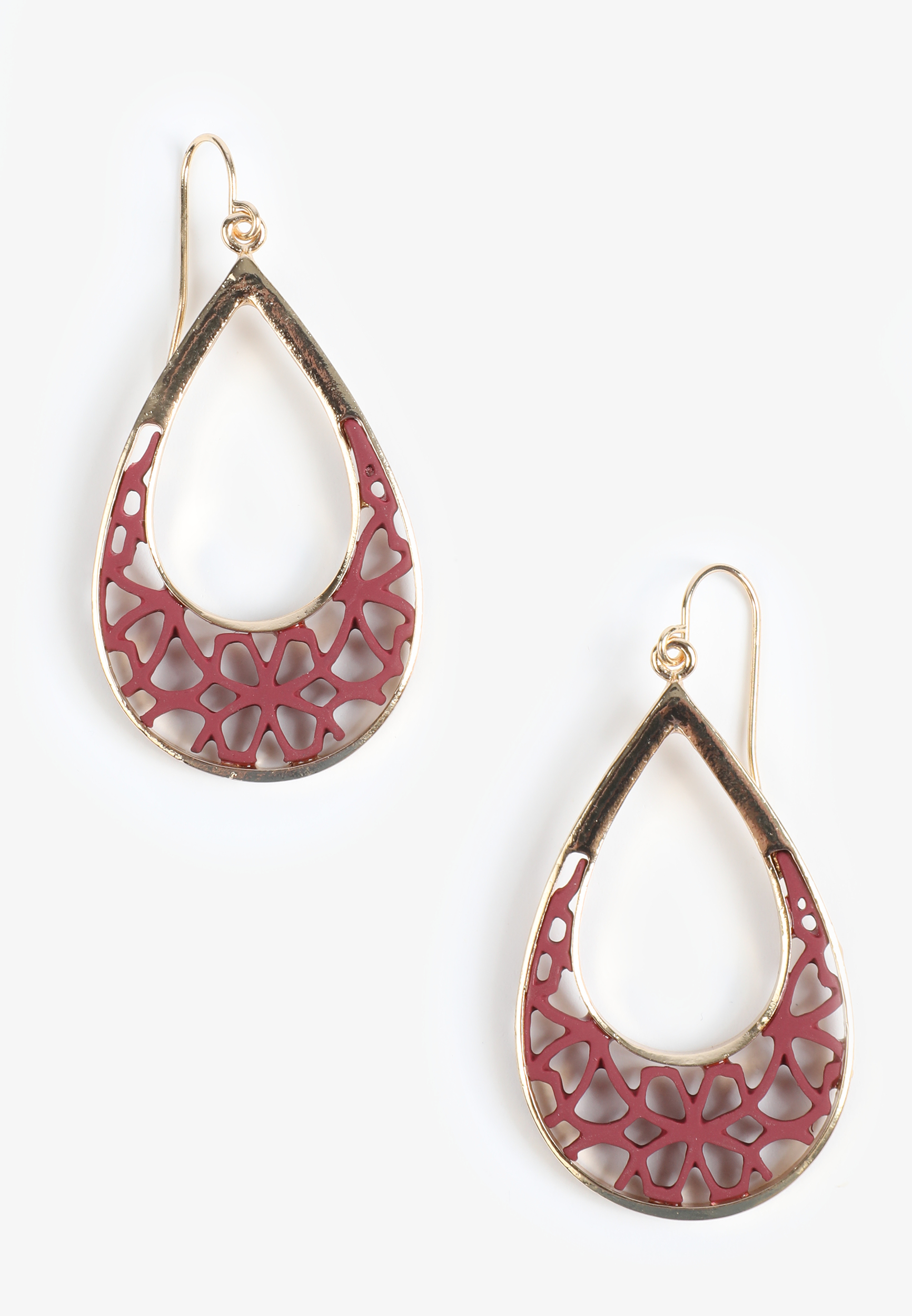 Gold And Burgundy Floral Cut Out Teardrop Earrings