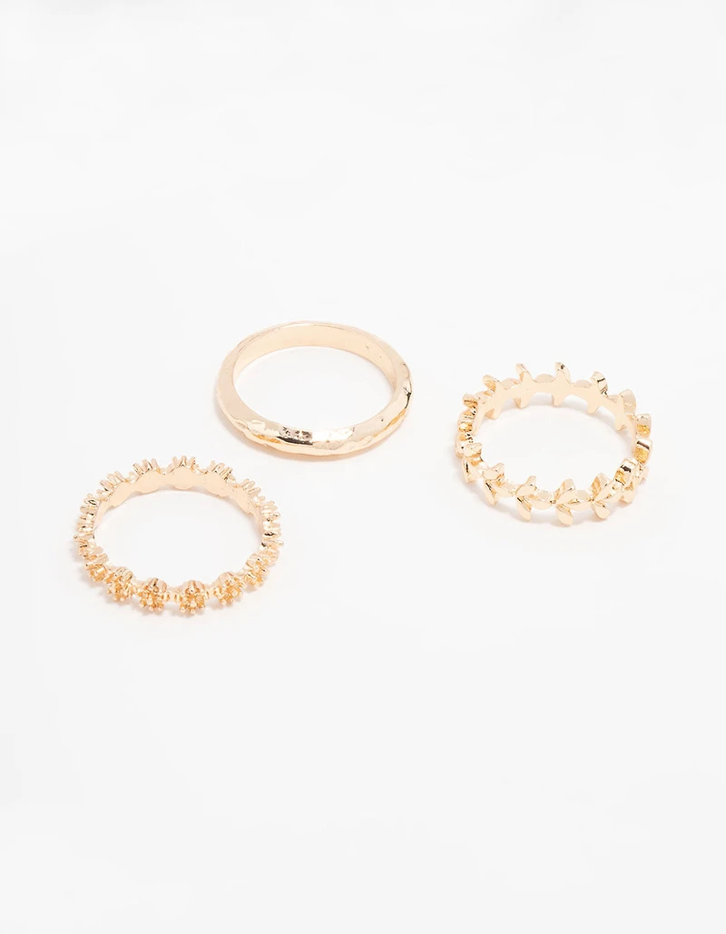 Upgrade your ring game with this stunning gold-toned trio! Featuring a vine design, a flower design, and a textured finish, they're perfect for a chic, stylish look. Colour: Gold Dimensions: Diameter 17 mm x Band Width 1 mm