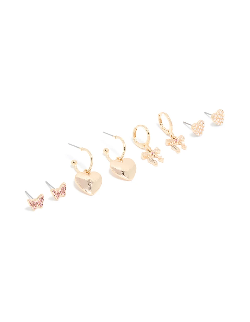 Fall in love with this Gold Heart & Dainty Bow Earrings Pack This cute jewellery pack includes pink diamante butterfly studs, open hoops with heart charms, bow huggie earrings and pearl-studded heart studs. Perfect for Valentine’s Day dates, parties or gifting, these heart and bow earrings pair beautifully with floaty dresses, soft knits or a simple tee and jeans. Mix and match the stud earrings, hoops and huggies to create a playful, personalised style every time you wear them. Colour: Gold, Pink Dimensions: Smallest Earring Length 7 mm x Smallest Earring Width 8 mm