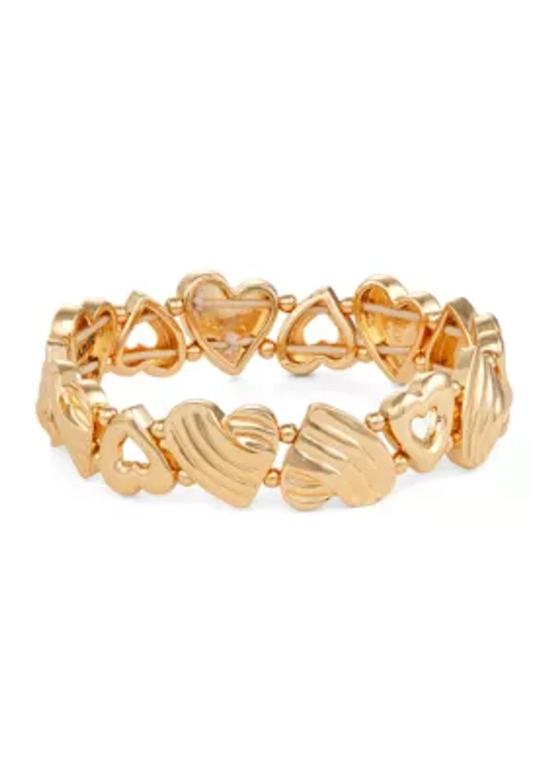 Charming and versatile, this Napier bracelet features polished gold-tone heart accents on a comfortable stretch band. Perfect for everyday wear or layering with other favorites, it adds a subtle touch of love and elegance to any outfit. Slip-on Imported Product Specifications 8" L Material & Care Gold-tone metal Clean with a soft cloth