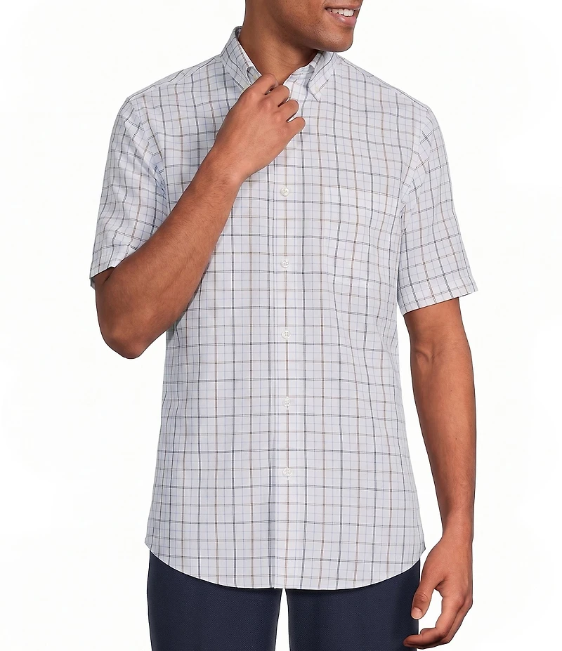From Gold Label Roundtree & Yorke, this shirt features: Medium plaid Slim fit Button-down collar Short sleeves Button-front closure Single patch pocket Non-iron Shrink resistant Resists pilling Cotton Machine wash warm/tumble dry Imported.
