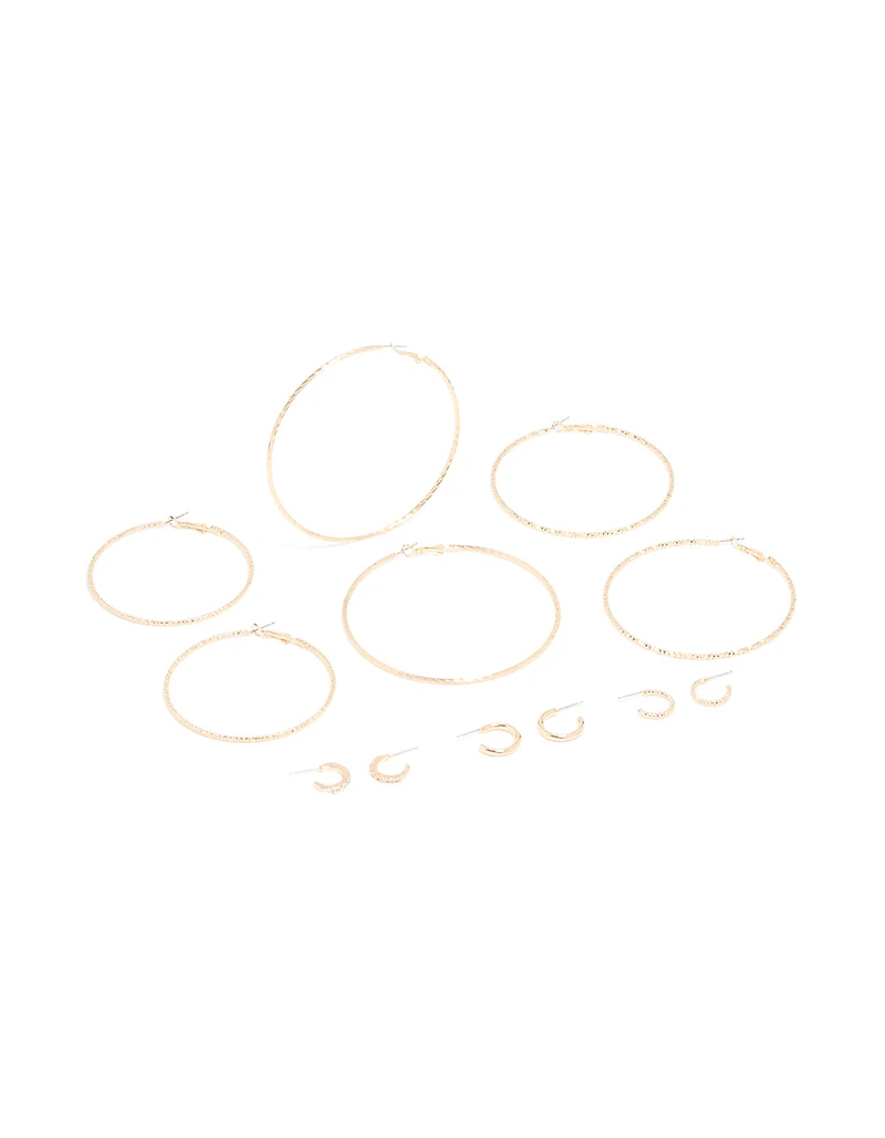 Turn every day into an earring moment with this Gold Mega & Small Hoop Earrings Pack. This fun jewellery set includes one pair of large hoop earrings, one pair of medium hoops, one pair of small hoops, plus three open mini hoops: diamante, smooth and textured. The gold-tone finish keeps things classic while the mix of sizes and styles lets you switch up your look in seconds. Wear the mega hoops with a party dress, the mini hoops with your favourite jeans and tee, or stack a few for an effortless layered ear look. Perfect for casual days, nights out and everything in between. Colour: Gold Dimensions: Smallest Earring Length 13 mm x Smallest Earring Width 2 mm