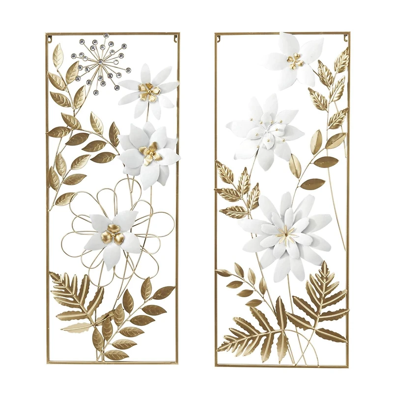 Inspired by blissful serenity and the allure of the sea, soothing hues and natural textures bring effortless charm to the home. This gold home wall décor set is crafted from robust and durable iron material, ensuring long-lasting beauty. The rectangle décor set for the wall is a stunning combination of satin gold and solid white iron finishes, giving it a sophisticated and luxurious appeal. This metal set of two wall decors showcases an intricate 3D design of swaying leaves and blooming flowers, all contained within an open-style frame for a unique touch. Each gold metal wall décor measures 14.35" x 2.45" x 35.45" and 14.50" x 1.50" x 35.60", and collectively weighs 5.84 lbs. Maximize your open wall space with this eye-catching horizontal display wall décor. The floral set of two wall sculptures can be used to bring elegance to any light-toned walls in your home, letting the beauty of nature shine through. This item ships in one carton and comes fully assembled. Metal wall décor makes a great gift for any occasion. Can be hung vertically using the keyholes; nails and screws not included. Suitable for indoor use only. This gold-colored metal wall sculpture comes as a set of two in coastal style.Details:Satin gold / Solid white14.35" x 2.45" x 35.45" , 4.50" x 1.50" x 35.60" Weighs 5.84 lbs Durable iron constructionSet of 2 wall décor piecesswaying leaves and blooming flowers themeIdeal for indoor wall decoration; suitable for light-toned walls