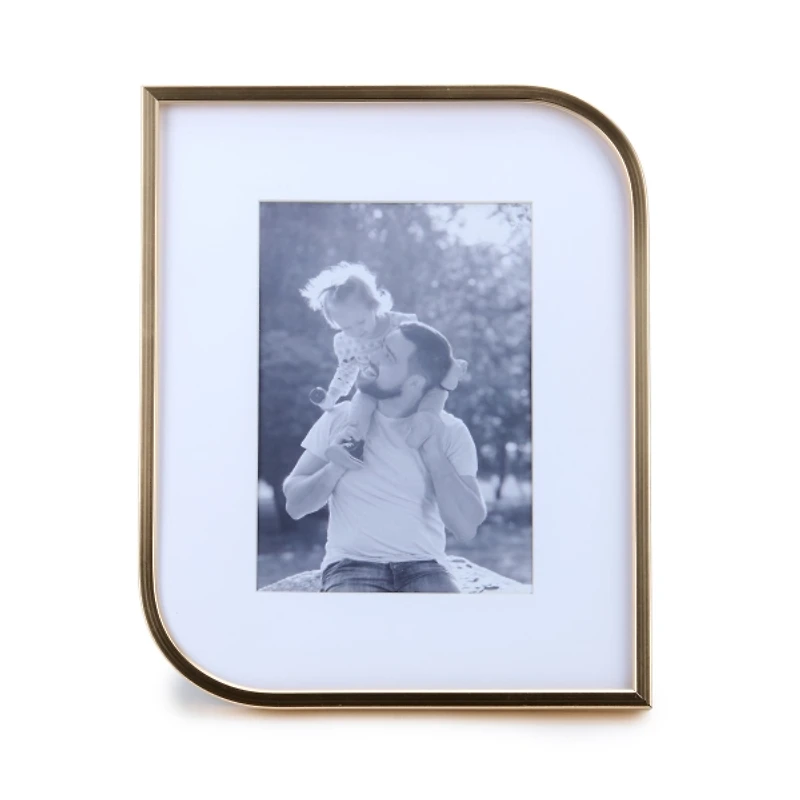 Sleek and understated, this Gold Metal Modern Picture Frame turns any photo into a charming display. It makes the perfect accent for contemporary spaces! Frame measures 8.3L x 0.73W x 10.3H in. Crafted of aluminum and glass Brushed gold finish Thin frame with two round corners and two pointed corners Holds one (1) 5x7 photo Easel back for tabletop display Care: Dust with a soft, dry cloth. Contact your local Kirkland's store for availability. Quantities and selection may vary by location. WARNING: Cancer and Reproductive Harm - For more information go to www.P65Warnings.ca.gov .