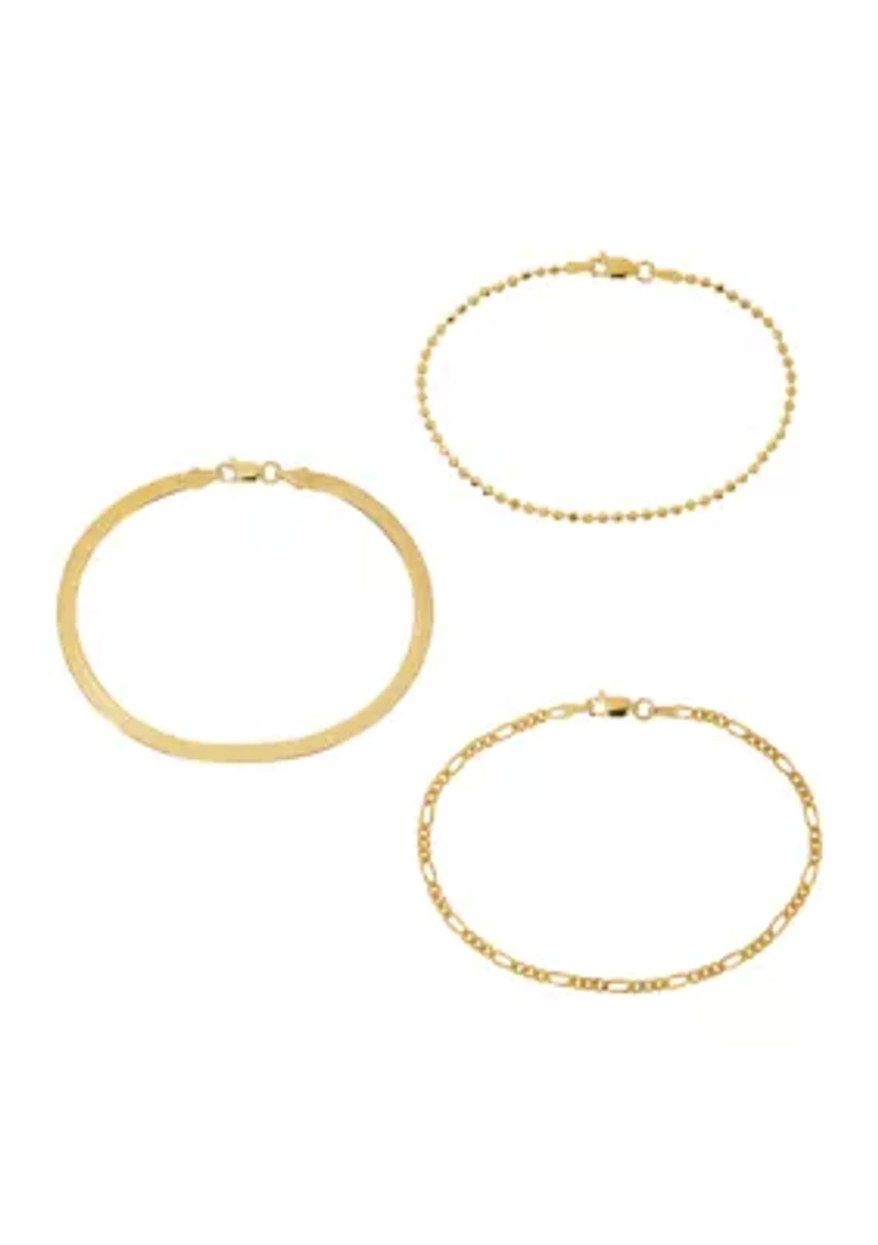 This set of 3 gold over silver plated chain bracelets from Belk Silverworks features a beaded chain, a herringbone chain, and a Figaro chain. Set of 3 Polished finish Imported Belk Exclusive Product Specifications 7" L Material & Care Gold over silver plated metal Clean with a soft cloth