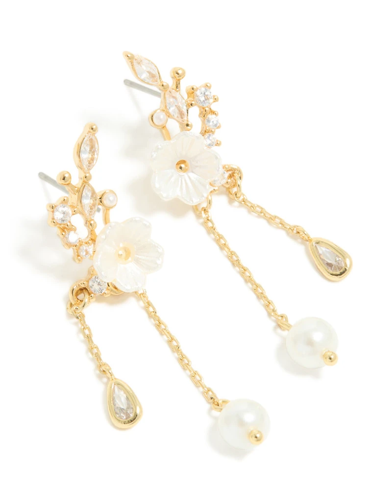 Gold Plated Cubic Zirconia Flower & Leaf Pearl Chain Drop Earrings