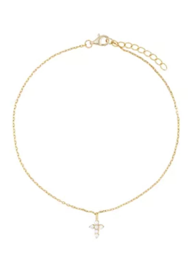 Gold Plated Sterling Silver 9" + 1" Extender Cubic Zirconia Cross Ankle Bracelet