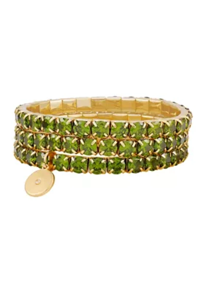 Make a bold statement with this Vince Camuto 14K gold-plated stretch bracelet set. Featuring three rows of vibrant green crystals, it brings a touch of luxury and sparkle to any look. 3-piece set Slip-on Satin finish Imported Material & Care Gold plated metal Clean with a soft cloth