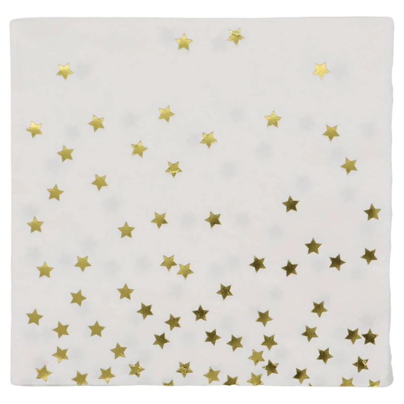 Give your next party a metallic flourish with these playful paper lunch napkins from Celebrate It that feature a print of shiny gold stars. Coordinate these eye-catching napkins with stylish plates and glassware for a table sure to stand out as you enjoy the festivities with friends and family.Details:Gold stars on white6.4" x 6.4" (16.2cm x 16.2cm) folded napkin size20 napkins3-plyTissue paper with foilWARNING: Do not place in the microwave—product may ignite.