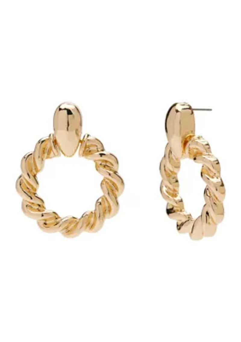 A twisted silhouette gives dimension to these hoop earrings from Crown & Ivy™. Post back earring Polished finish Imported Belk Exclusive Product Specifications 1.87" x 1.4" Material & Care Titanium Gold-tone metal Clean with a soft cloth