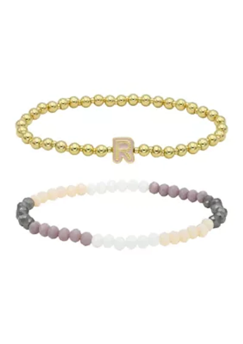 Gold Tone and Multi Beaded Bracelet Duo with Enamel K Initial Charm