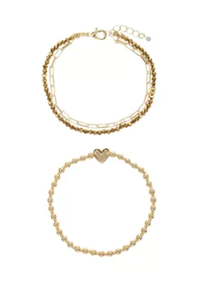 Gold Tone Beaded Bracelet with Heart Charm and Multi Strand Link and Beaded Bracelet Set