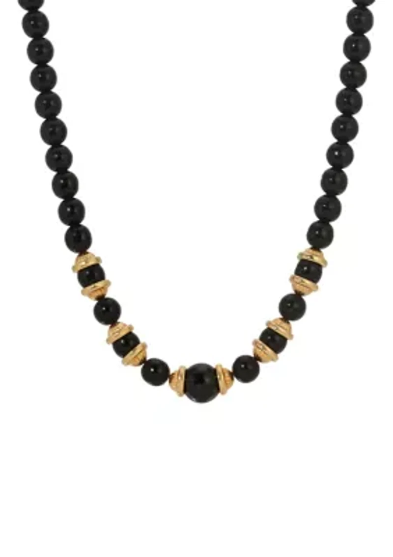 A refined necklace featuring smooth round jet-black beads accented with polished corrugated gold caps. The alternating design highlights the contrast between the deep onyx tones and the warm gold details, creating a luxurious rhythm. Perfect for both evening attire and formal ensembles, it captures understated sophistication in every curve. Lobster closure, 29 Polished finish USA Imported Product Specifications 16"L X .7"W X .5"W, 16" Material & Care Metal, Gold-tone metal Clean with a soft cloth.