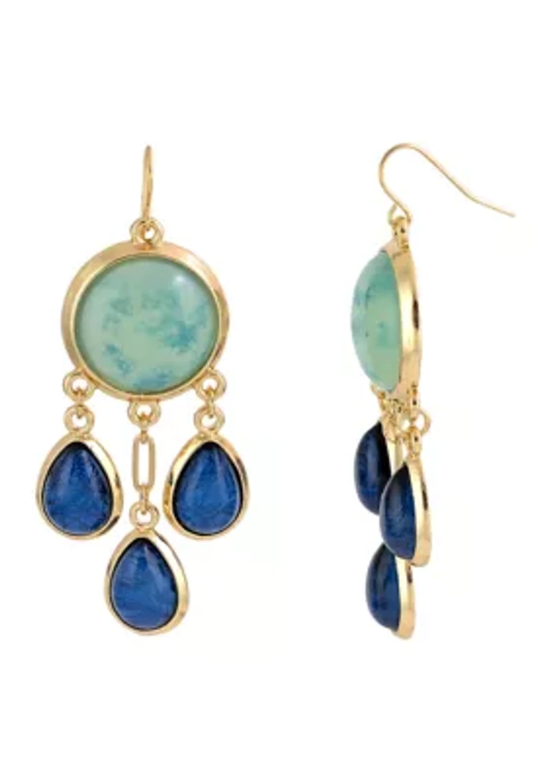 Gold Tone Blue And Green Round Cabochon With Triple Navy Teardrops Earrings On French Wire