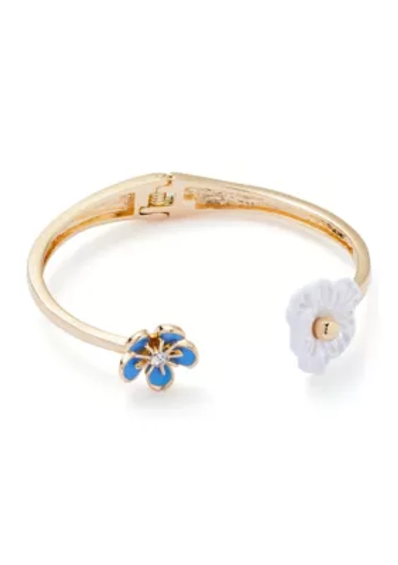 Gold tone Blue Flower Hinge Bangle Bracelet